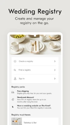 Celebrate life’s biggest moments with West Elm’s easy-to-use registries. Build, manage, and share your wedding, baby or gift registry directly from the app to make gift-giving simple and stress-free for friends and family. Choose from high-quality, timeless furniture, decor, dinnerware and all the essentials you'll need.